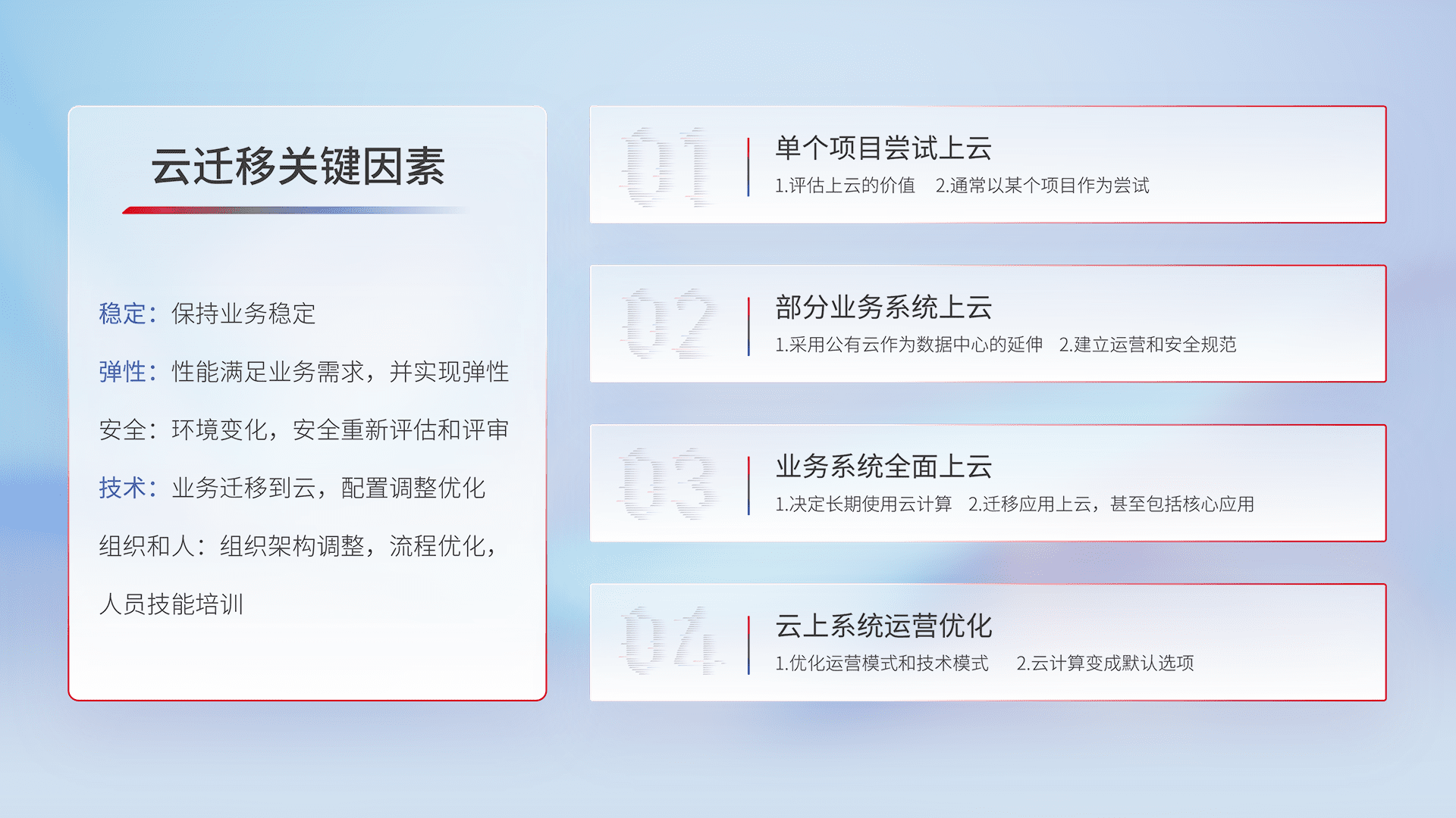 结合实际业务,,从规划设计、、、云平台选型、、云原生改造、、、、数据迁移、、、集成交付,,,,迁移全过程为客户识别最佳上云路径,,,,做好风险识别管理,,,,设计网络架构、、、身份权限、、、、安全审计合规、、、、操作审计、、、日志审计、、、、监控告警策略、、多站点容灾设计等,,,,对云上基础设施进行整体规划,,,,提升IT治理水平,,,以满足弹性、、、高可用、、、、高性能的需求。。