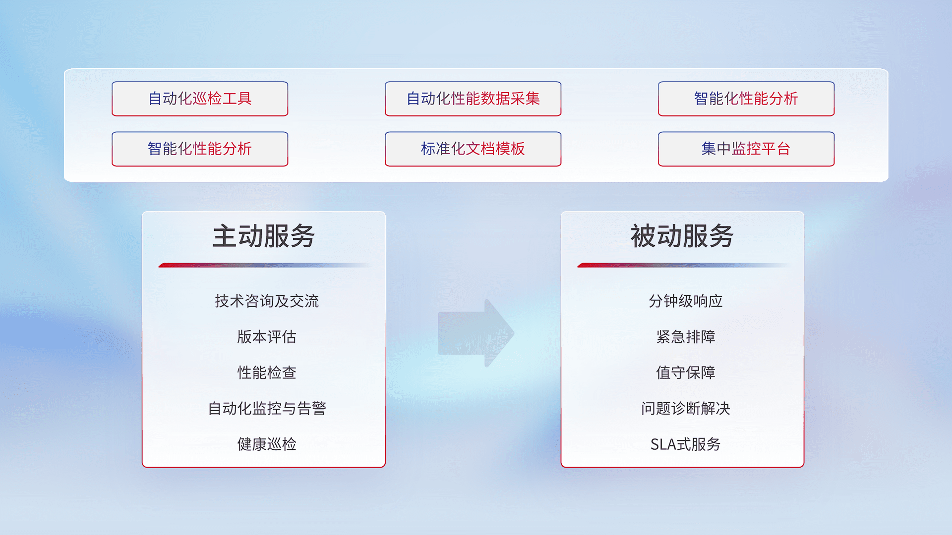 智能化工具和标准化文档,,保障服务质量,,,提供主动服务(包含技术咨询、、、版本评估、、性能检查、、、自动化监控与告警、、、健康巡检)和被动服务包含(分钟级响应、、、紧急排障、、、、值守保障、、、问题诊断解决、、、SLA服务)。。
